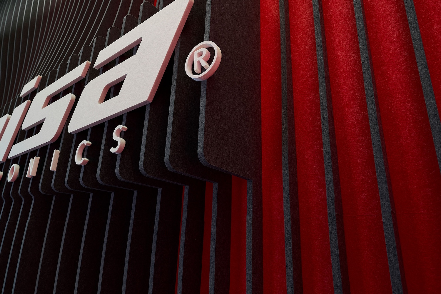 Im Empfangsbereich wird Akustik zum Design: die suonoBLADES in Grau und Rot vereinen Funktionalität mit Markenidentität. Das integrierte Trisa Logo macht die Installation zu einem starken architektonischen Statement.