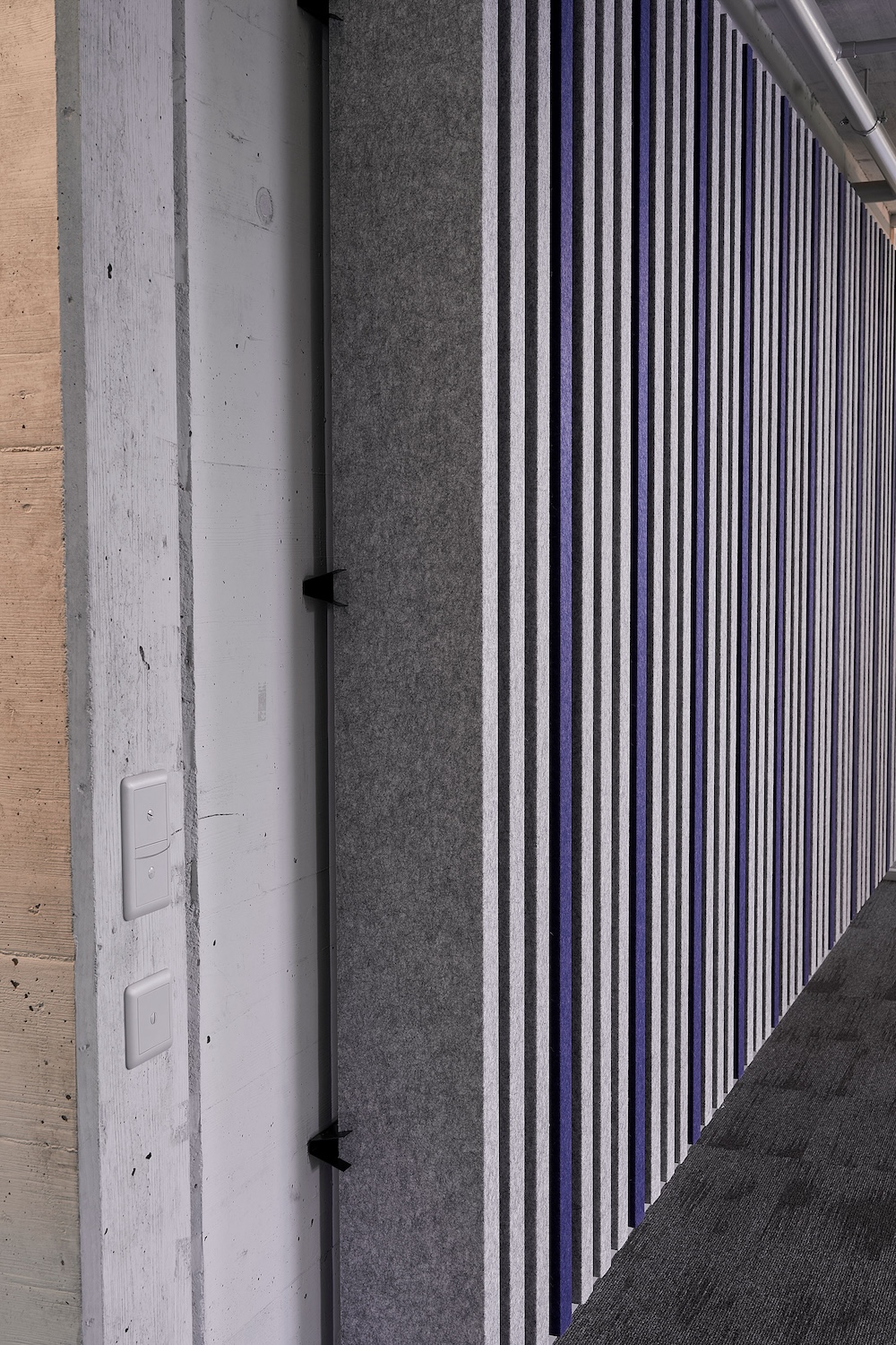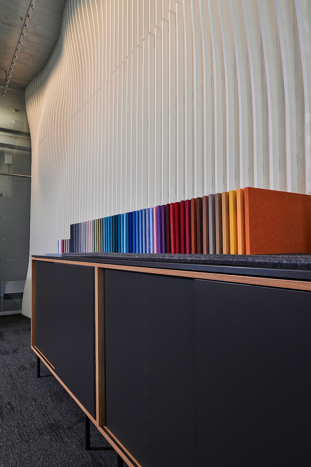 In den weitläufigen Räumen sorgt die suonoSCULPTURE WAVE für einen Blickfang, der sofort ins Auge fällt: Die rhythmischen Wellen verleihen den Flächen eine lebendige Dynamik und lassen zugleich eine ruhige, akustisch ausgewogene Atmosphäre entstehen. Als Kontrapunkt dazu steht die strenge, vertikale Konstruktion aus suonoBOARD-Einzelelementen, eine architektonische Lösung die dem Raum Tiefe und Charakter verleiht.