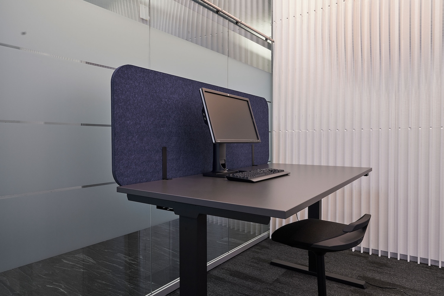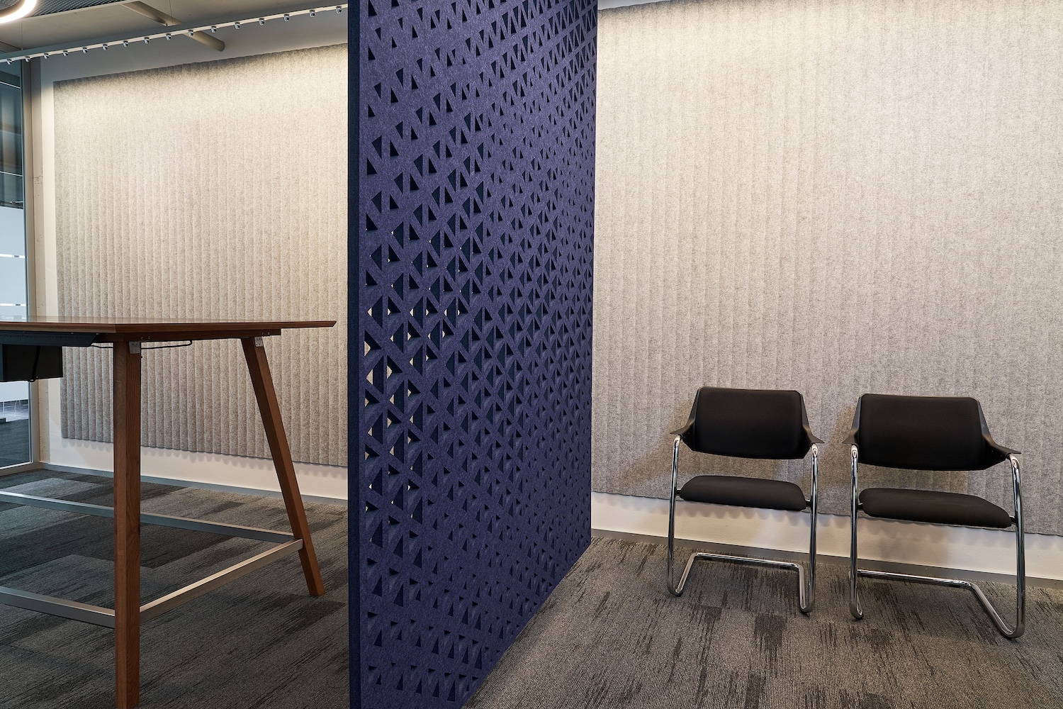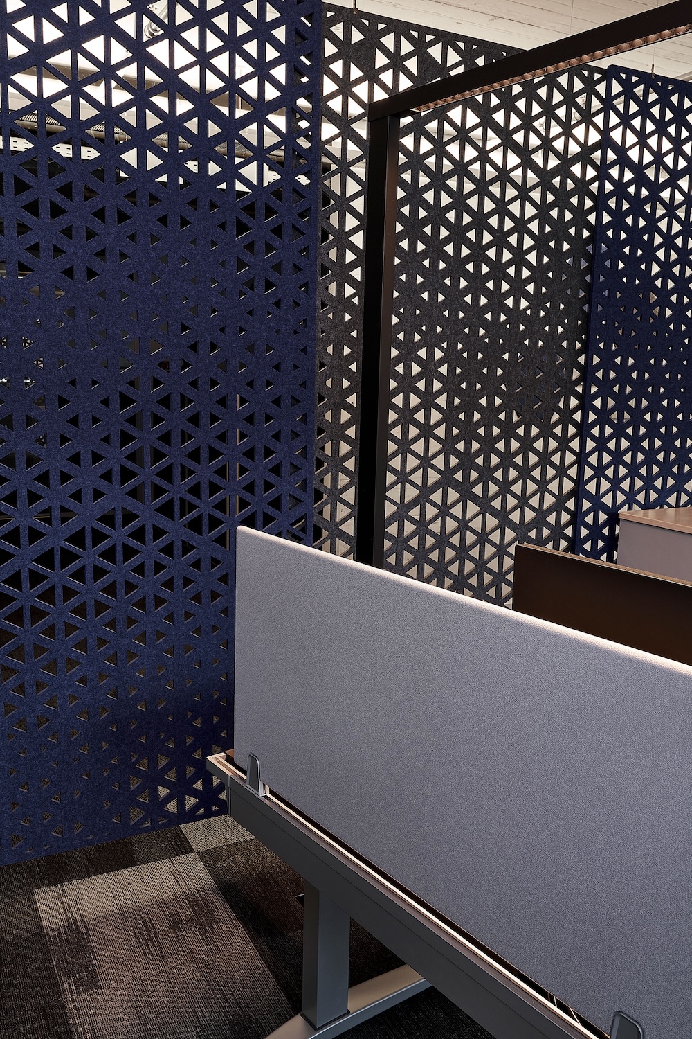 In den Arbeitszonen sorgen suonoCURTAIN in Blau und Grau für eine spürbar angenehmere Raumakustik. Ihr Design wurde harmonisch auf die suonoTILES HEXAGON abgestimmt. Entlang von Gängen schaffen die Vorhänge diskrete Zonen und mehr Privatsphäre. Ergänzt werden sie durch mobile Lösungen wie suonoMOVE und suonoSTAND, verschiebbare Raumtrenner, die je nach Bedarf Arbeitsplätze oder Meetingbereiche abschirmen.