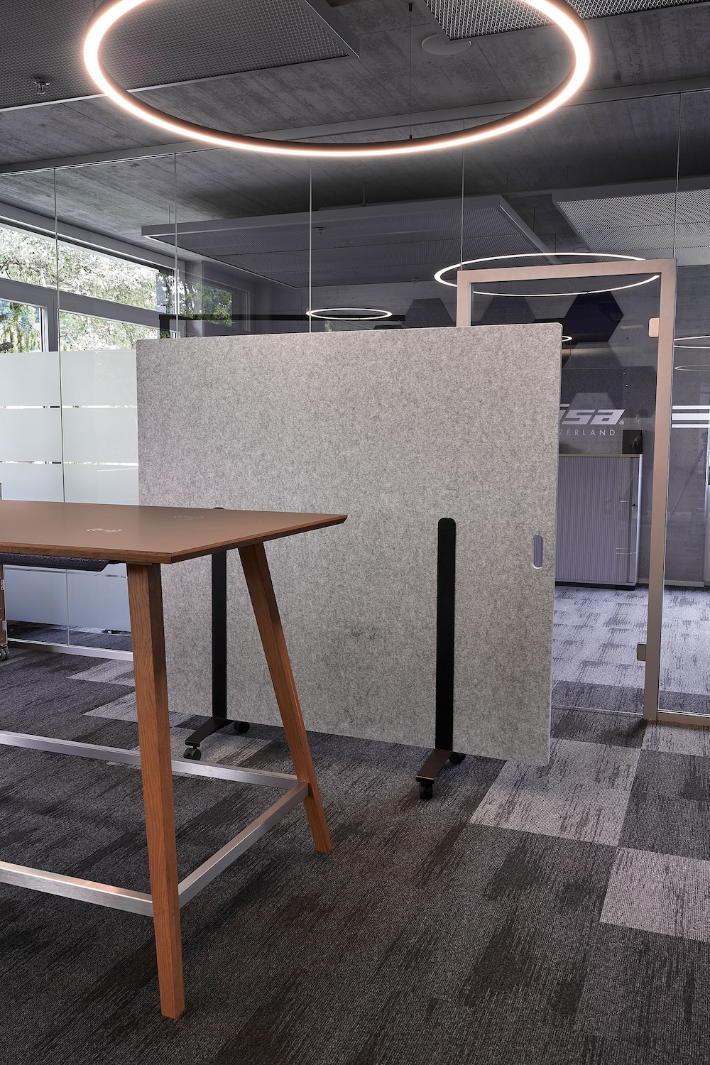 Die suonoMOVE ist eine freistehende Trennwand auf Rollen mit Stopper, hergestellt aus 100 % PET Fasern mit filzartiger Haptik, für optische und akustische Privatsphäre.